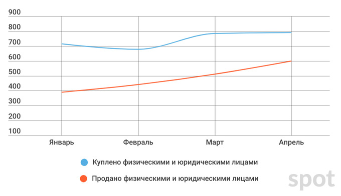 В то же время продажа валюты экспортерами и населением, согласно отчетам ЦБ, расчетно составила около 1,94 млрд долларов. ЦБ, в свою очередь, с января по апрель приобрел 134,2 млн долларов, а продал — 978,5 млн долларов, что, по-видимому, было призвано сбалансировать рынок.