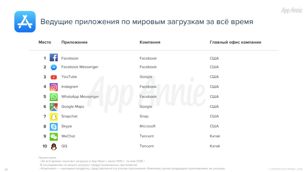 Компания назвала самые популярные приложения с 2010 по 2018 год. Первое место занимает Facebook, второе — Facebook Messenger, третье — YouTube, четвертое — Instagram, пятое — WhatsApp.