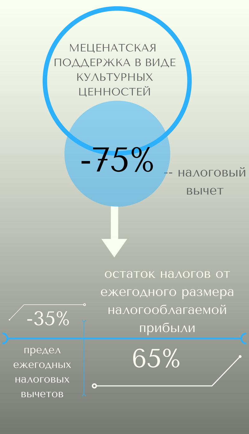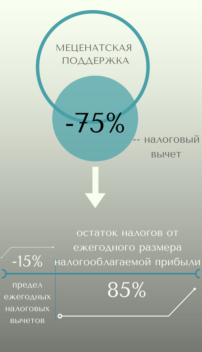 То есть меценаты в виде физических и юридических лиц могут спонсировать некоммерческие организации, занимающиеся развитием культуры и искусства и получить вычеты как от стоимости поддержки, так и от общего размера ежегодно налогооблагаемой прибыли.