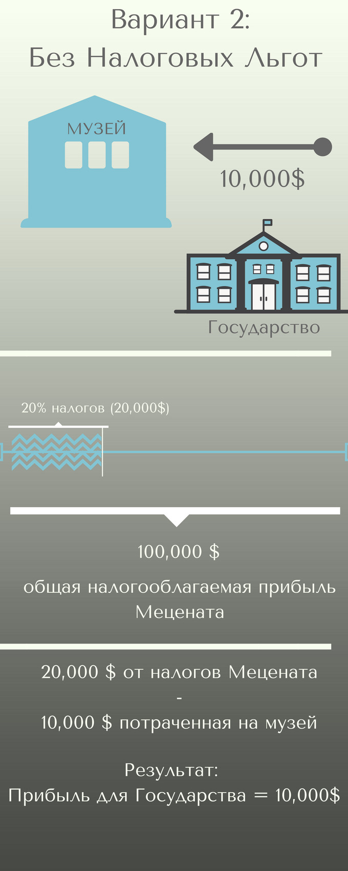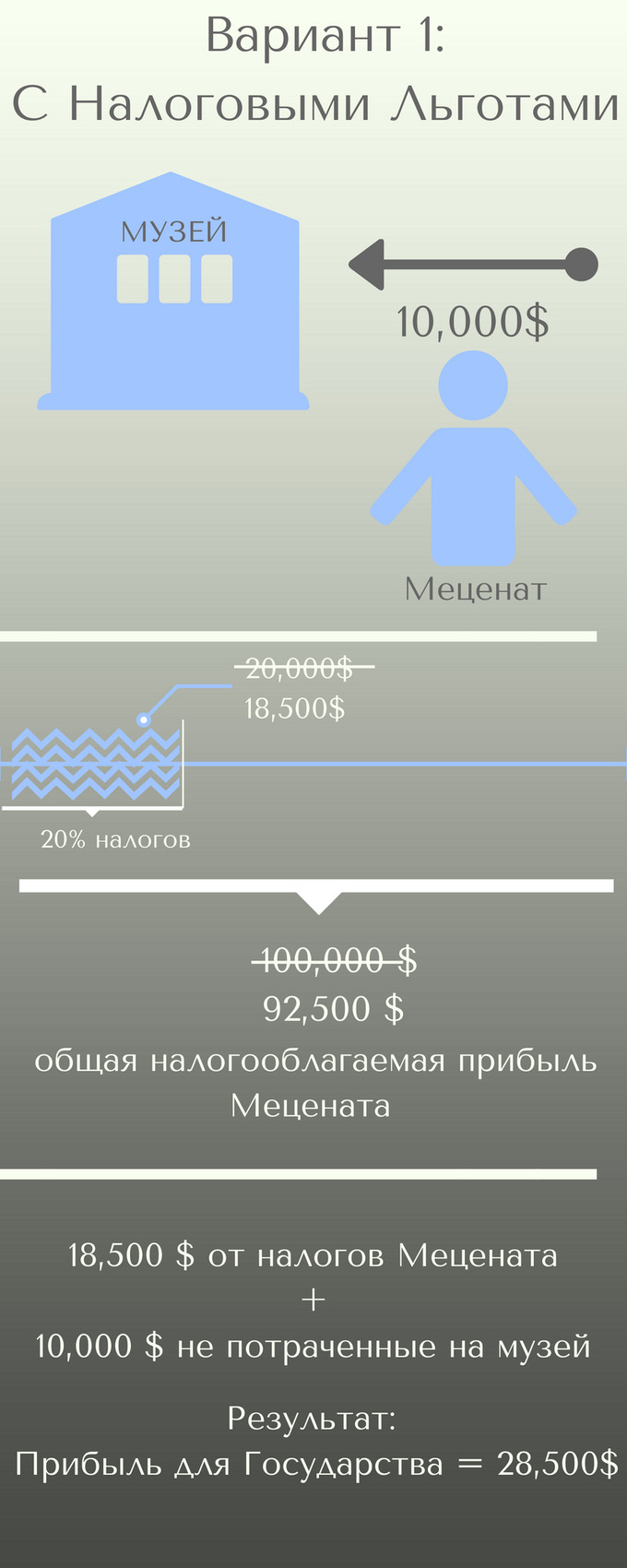 Таким образом, фактически, государству больше не надо будет предоставлять 10 тысяч долларов музею, сверх этого получая 18,5 тысяч долларов ежегодных налогов от мецената. Получается, в конце года у государства будет 28,5 тысяч долларов.