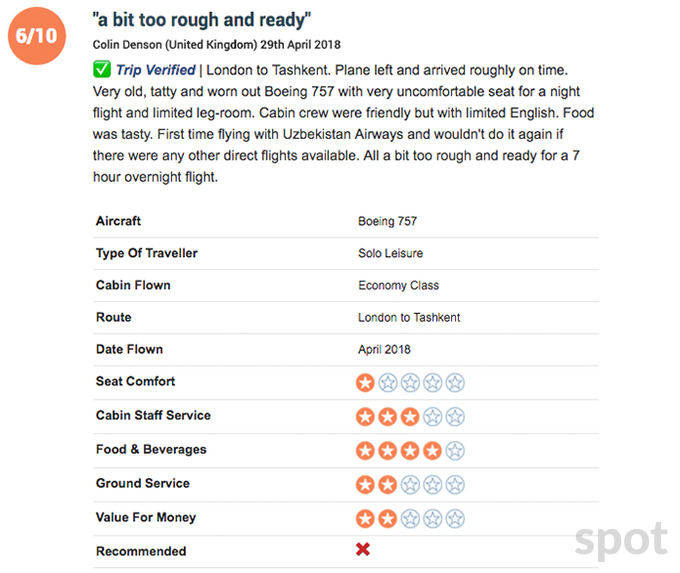 Последний отзыв о НАК с сайта Skytrax. Колин Денсон (Великобритания), 29 апреля. «Лондон — Ташкент. Самолет вылетел и прибыл точно по расписанию. Очень старый и изношенный Boeing 757 с очень неудобным для ночного полета сиденьем и маленьким пространством для ног. Экипаж был приветлив, но с ограниченным английским. Еда была вкусной. Впервые летел „Узбекскими авиалиниями“ и больше не полечу, если будут доступны другие прямые рейсы. Всё слишком небрежно для семичасового ночного полета».