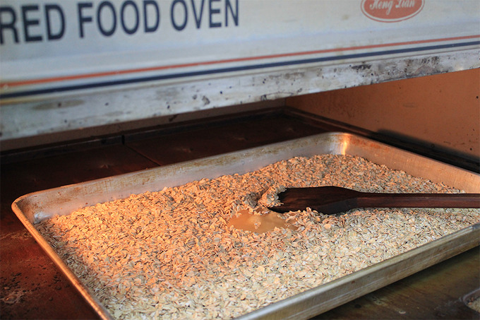 - Овсянка томится в печи с медом, затем смешивается с сиропом-связкой.