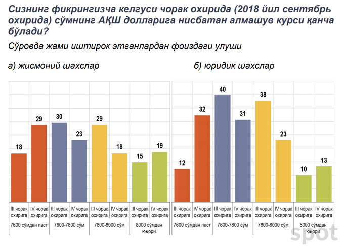 По итогам опроса вариант «7600−7800 сумов» выбирали чаще всего как физические лица (30%), так и юридические (40%). Чуть меньше опрошенных склоняются к варианту «7800 — 8000 сумов» — их 29% и 38% соответственно.