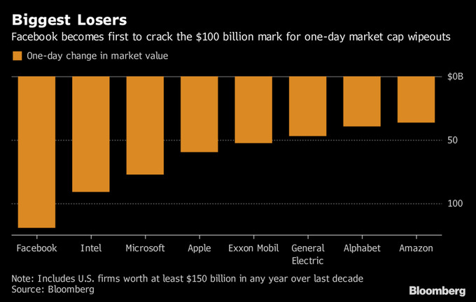 Facebook вошел в историю по уровню убытков за одни сутки, пишет Bloomberg.