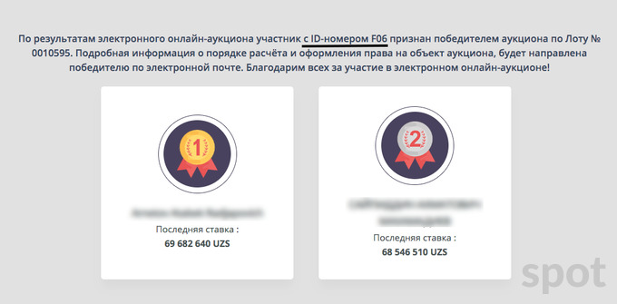На этом скриншоте Spot скрыл персональную информацию участника и победителя аукциона, но она остается доступной на самом сайте.