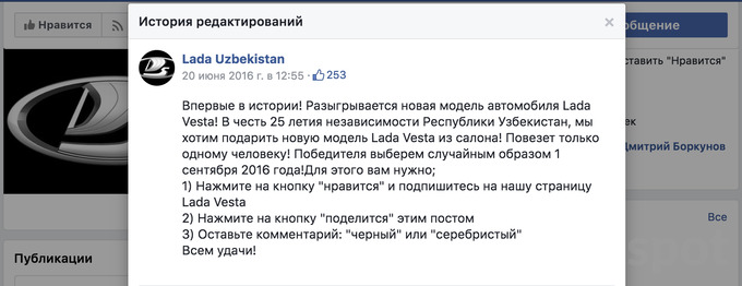 На официальной странице Lada в Узбекистане подтвердили, что не имеют никакого отношения к этой акции, а пост и сама страница, где якобы разыгрывается автомобиль, являются простым фейком.
