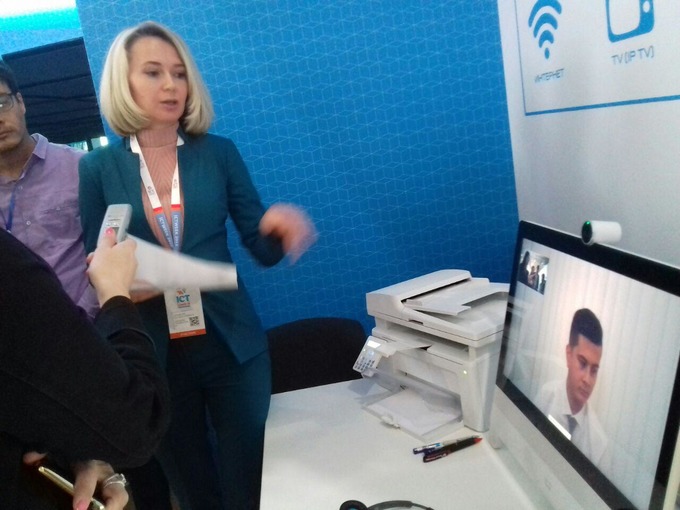 На стенде «Узбектелеком» посетители могли протестировать пилотный проект компании «Дистанционный офис продаж». На небольшом столе установлено два монитора, многофункциональный принтер и наушники. По видеозвонку абонент связывается с оператором, который находится в едином контакт-центре в Ташкенте и получает услуги, которые предоставляются в офисах «Узбектелекома».