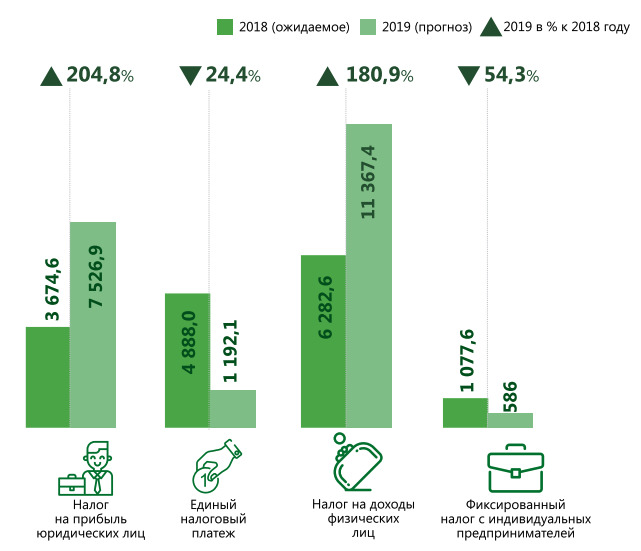 Увеличение поступлений по налогу на доходы физических лиц (на 181%) ожидается от легализации численности работников и фонда оплаты труда в компаниях за счет введения плоской шкалы в размере 12% и отмены страховых взносов граждан.