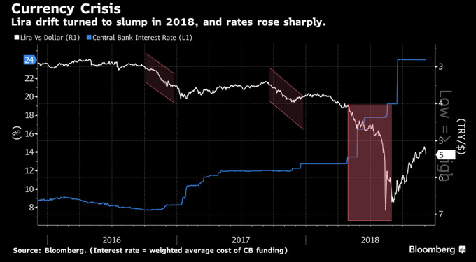 В мае, за месяц до выборов, Эрдоган заявил, что в случае победы усилит контроль над ЦБ, что он и сделал, но лира, на фоне очередной ссоры с США в августе, резко обвалилась до новых минимумов.
