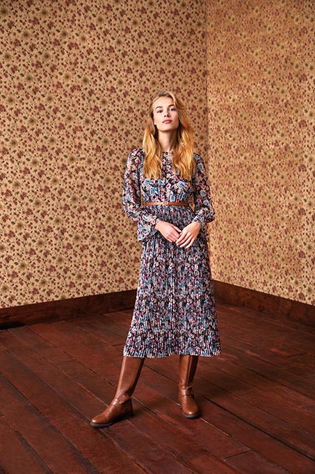 Новая коллекция женской одежды представлена как в традиционных тонах — белом, черном и темно-синем, так и в различных теплых оттенках: красный, пурпурный, горчичный и беж. Ярким акцентом стали животные принты.