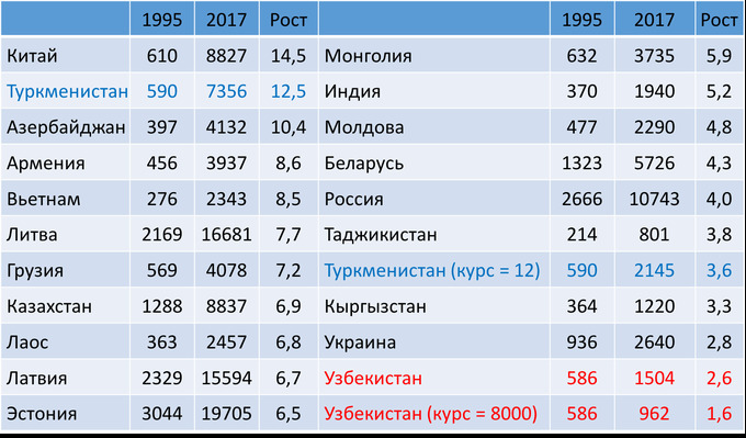 Что мешает развитию нашей экономики? Возьмем не данные Госкомстата, который еще совсем недавно рисовал более 8−9% экономического роста из года в год, а наш официальный показатель ВВП, рассчитанный по обменному курсу в долларах. И посчитаем ВВП с 1996 года. Если считать по курсу примерно 8 тысяч сумов за доллар, то ВВП на душу населения в Узбекистане в 2017 году составил меньше $1000 на человека в год.