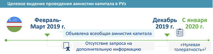 Что касается Узбекистана, то в результате реализации вышеуказанных мер можно ожидать дополнительное привлечение денежных средств в банковскую систему и на рынки капитала Узбекистана в объеме $15−25 млрд, а также снижение размера неофициальной экономики и уровня коррупции.