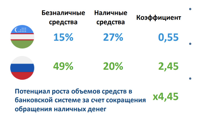 Отношение безналичных денег к наличным (0,55) очень низкое, что является одним из важнейших индикаторов высокой доли неофициальной экономики согласно методологии Международного валютного фонда. На примере сравнения с Россией видно, что есть куда расти: