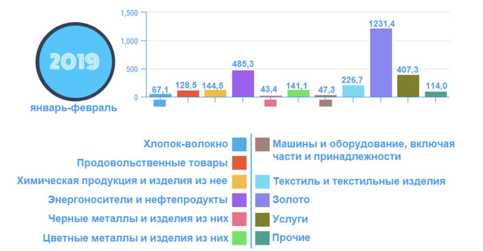 Если сравнивать с 2018 годом, то существенных изменений в структуре экспорта не произошло, однако доля экспорта всех видов товаров и услуг, кроме золота, в январе-феврале 2019 года увеличилась.
