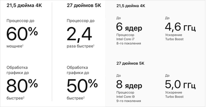 iMac оснащен процессорами Intel Core восьмого и девятого поколений, высокоскоростным накопителем Fusion Drive (по умолчанию устанавливается на все модели 27 дюймов и доступен для модели 21,5 дюйма) и графическим процессором Radeon Pro 500X.