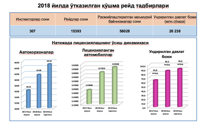 В рейдах приняли участие 307 инспекторов. В результате было оформлено 56 028 административных протоколов и взыскано государственной пошлины на 26,2 млрд сумов.