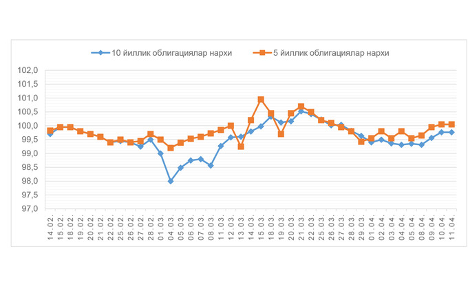 Колебания цен на 5-летние международные облигации к их номинальной стоимости составляют от 99 200 до 100 950% (с доходностью от 4 532 до 4 933%), в том числе по состоянию на 19 апреля — 100 333% (доходность — 4 670%).