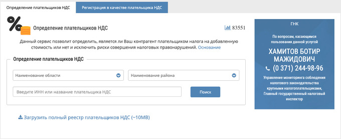 Информацию о контрагенте можно получить на сайте налогового комитета. Для получения информации о контрагентах в выбранном окне можно воспользоваться функциями поиска по наименованию области, района или названию плательщика НДС либо ИНН: