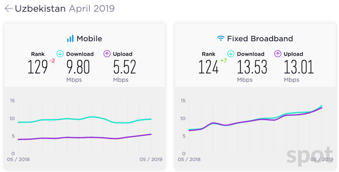 Узбекистан немного ухудшил свои позиции по скорости мобильного интернета, опустившись на 129-е место, хотя скорость выросла с 9,4 Мбит/с до 9,8 Мбит/с.