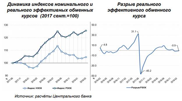 Согласно предварительным расчётам, разрыв реального обменного курса в этом периоде имел тенденцию к сокращению. В результате, к концу марта реальный эффективный обменный курс восстановил своё равновесное состояние: