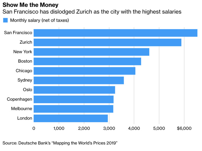 Deutsche Bank в своем исследовании Mapping the Worlds 2019 назвал города с самыми высокими зарплатами. Об этом пишет Bloomberg.