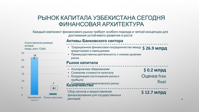 Чтобы эффективно развивать экономику Узбекистана, сбалансировать структуру ее финансирования, необходимо развивать рынок капитала, подчеркнул глава агентства. Он также перечислил основные барьеры, которые мешают этому развитию.