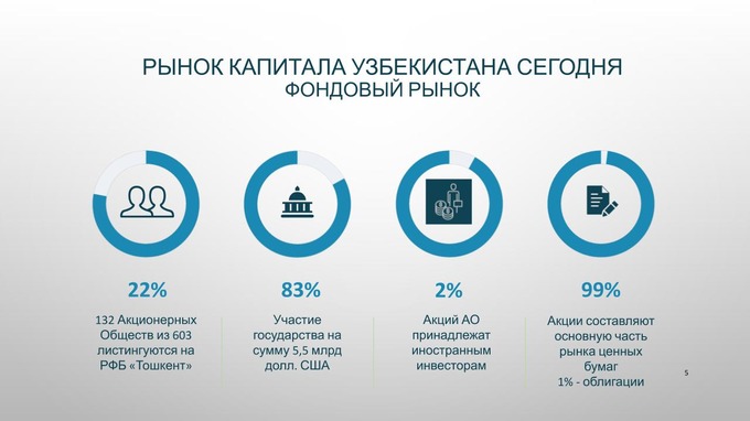 Развитию рынка капитала в Узбекистане препятствуют низкий уровень финансовой грамотности населения, сложность законов, отсутствие институциональных инвесторов, большая доля государства в акционерных обществах, а также недостаточное количество инструментов защиты интересов акционеров.