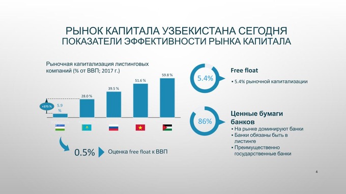 В Узбекистане же активы банковского сектора в 130 раз превышают free-float всех ценных бумаг на рынке капитала.