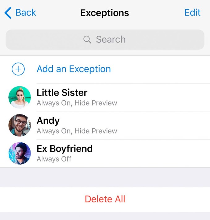 Теперь можно настроить предварительный просмотр сообщений для определенных чатов. Если настроено много исключений, то можно воспользоваться «Поиском», чтобы найти нужный чат, или «Удалить все», чтобы сразу вернуться к исходной точке.