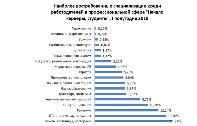 Работодатели активно ищут кандидатов без опыта для работы в области продаж, консультирования, туризма, гостиничного, ресторанного бизнеса, административного персонала, информационных технологий.