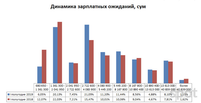 Наиболее востребованным размером заработных плат является диапазон от 2 722 600 до 4 083 900 сумов. На втором месте, с минимальным отрывом от лидирующей позиции, стоит заработная плата в размере от 1 361 300 до 2 041 950 сумов: