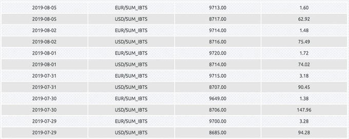 Торги на межбанковской торговой сессии УзРВБ 5 августа по паре доллар/сум закрылись на отметке 8717 сумов за $1, что на 11 сумов больше, чем 30 июля. Торги по паре евро/сум закрылись на отметке 9713 сумов за единицу.