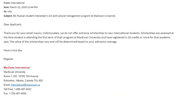 Я написала в канадский Университет Макьюэн с просьбой разъяснить возможные способы получения стипендии и получила такой ответ: