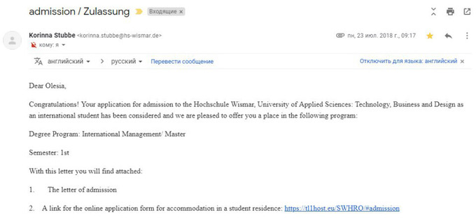 26 июля 2018 года я получила письмо из Hochschule Wismar:
