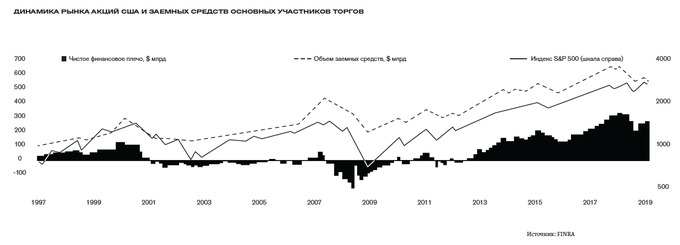 Еще одним признаком надвигающегося падения можно считать то, что ралли первого полугодия 2019 года, выведшее S&P500 на новый исторический максимум и почти на 1 п. п. опустившее краткосрочные ставки, сопровождалось лишь минимальным увеличением плеча крупных спекулянтов.