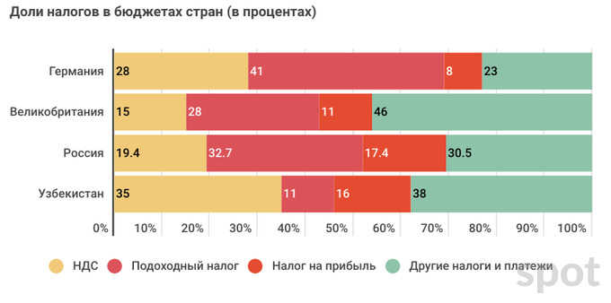В Узбекистане разница в долях НДС и налогов на доходы очень существенная — около 8 процентных пунктов. То есть эти налоги сильно недооценены: на НДС приходится 35%, на подоходный налог — 11%, на налог на прибыль — 16%.