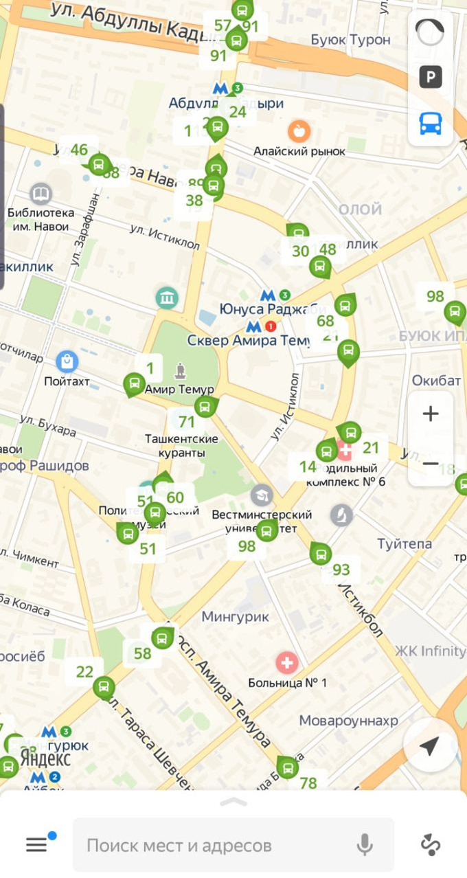 Сейчас «Яндекс» показывает почти все государственные автобусы Ташкента. В приложении они отмечены специальными значками.