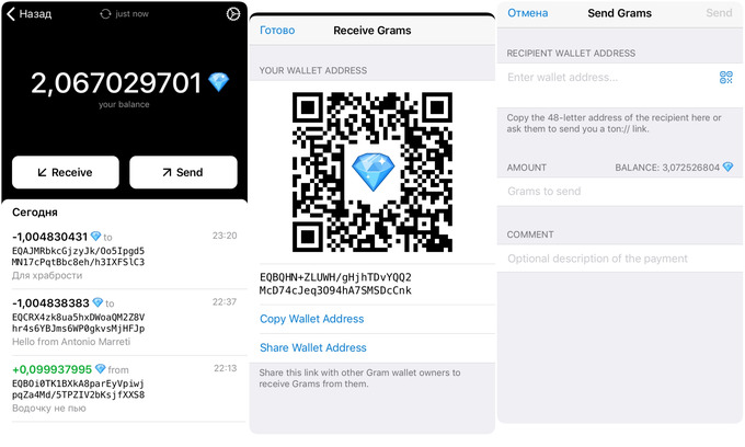 Пока что в Telegram доступен функционал создания и удаления кошелька, а также возможность принимать и отправлять граммы. Адресом своего кошелька можно поделиться в том числе через QR код.