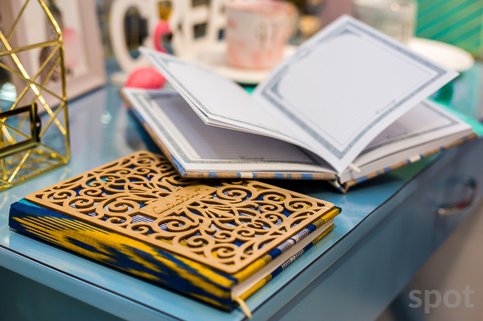 За пять лет мы выпустили 15 коллекций блокнотов, большинство в национальном стиле. Мы использовали разные материалы: делали решетчатую деревянную вставку на обложке в стиле панджары (узорчатая оконная решетка — прим. Spot), заказывали миниатюры у бухарских художников, покупали старинные полотна сюзане, сдавали их в химчистку и декорировали ими блокноты.