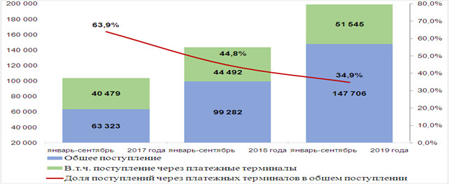 Так, если в январе-сентябре 2017 года доля поступлений через платежные терминалы в общем поступлении составила 63,9%, то в январе-сентябре 2018 года этот показатель составил 44,8%, в январе-сентябре текущего года упал до 34,9%: