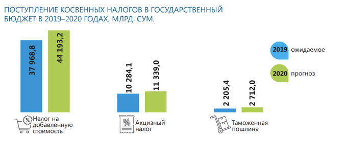 Доходы на 2020 год запланированы в размере 128,4 трлн сумов (или 20% к ВВП), что на 15,8 трлн сумов больше, чем ожидается по итогам 2019 года.