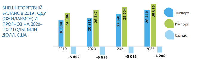 Объем внешней торговли в 2020 году прогнозируется на уровне $46,9 млрд с отрицательным сальдо $5,8 млрд. Основным фактором роста дефицита будет увеличение импорта технологического оборудования и техники.