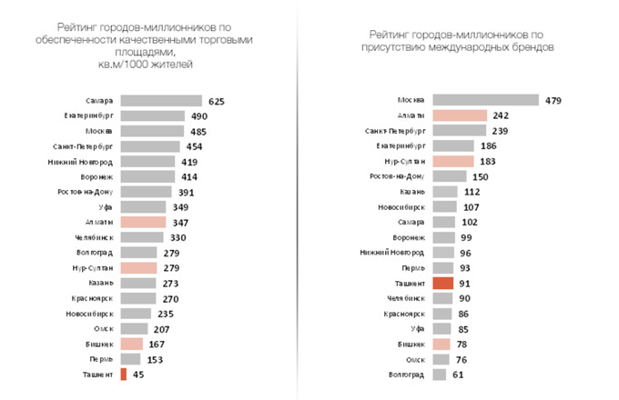 «Например, обеспеченность жителей Москвы площадями в современных ТРЦ в 10 раз выше, чем в Ташкенте, а жителей Алматы — в 8 раз. Даже в случае реализации на территории Ташкента всех заявленных проектов в сфере торговой недвижимости, показатель обеспеченности составит 125 м²/1000 жителей, что будет все равно меньше чем, к примеру, в Бишкеке на текущий момент. Эти цифры отражают крайне низкий уровень насыщения рынка качественной торговой недвижимостью столицы Узбекистана, даже если принимать во внимание разницу в уровне жизни в различных странах и городах», — приводит в пример эксперт.