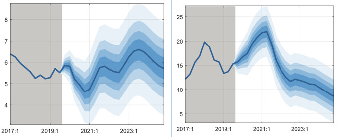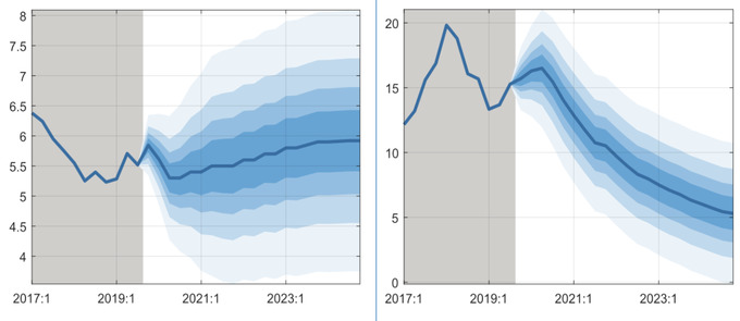 Это может продолжиться до 2022 года, после чего показатели начнут приближаться к базовому сценарию (5,5%-5,8%). Рост инфляции в альтернативном сценарии в 2020 году составит 19−20%, в 2021 году 15%, а в 2022 году — 12%.
