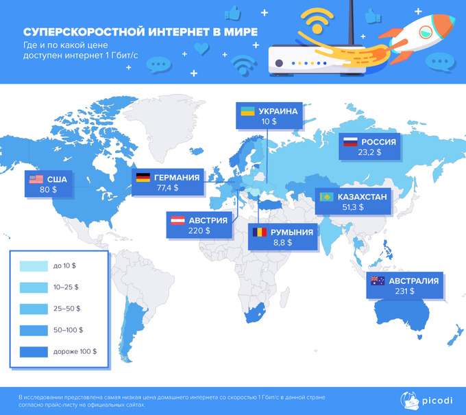 Высокоскоростной интернет 1 Гбит/с по стоимости ниже 20$ можно найти в Румынии, Украине, Венгрии, Индии, Молдавии и Латвии.