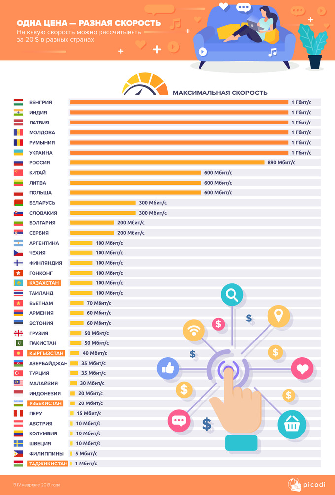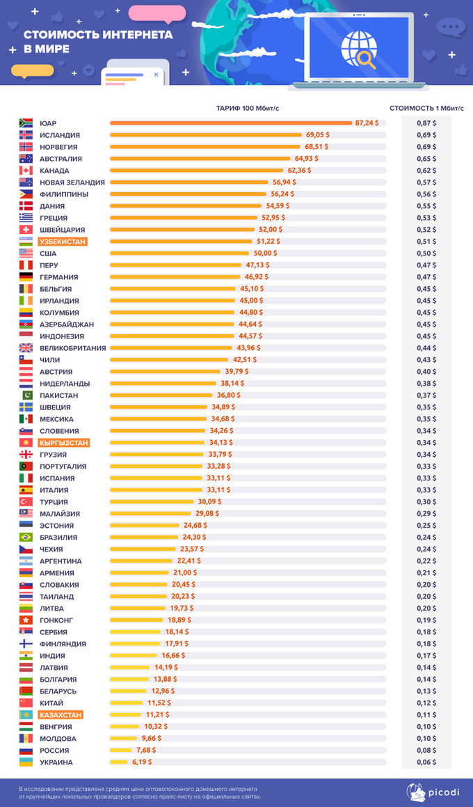 В России по такой цене доступен высокоскоростной интернет 890 Мбит/с, в Кыргызстане — 40 Мбит/с, в Узбекистане — 20 Мбит/с, а в Таджикистане — 1 Мбит/с.