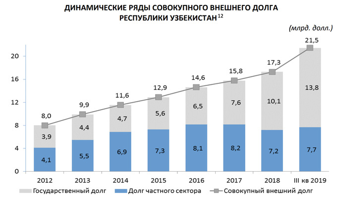 Совокупный внешний долг Узбекистана по состоянию на 1 октября 2019 года составил $21,5 млрд, увеличившись за год на $5,1 млрд, следует из данных Центрального банка.