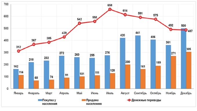 Несмотря на сезонное снижение денежных переводов, в декабре был зафиксирован исторический максимум по продаже (500 млн) и покупке (305 млн) населением наличной иностранной валюты.