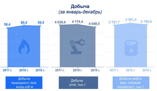 По сравнению с 2018 годом, добыча угля снизилась на 3%, нефти — на 6,3%, природного газа — на 1,6%. Помимо этого, снизилась добыча газового конденсата на 2,2% и щебня — на 24,2%.