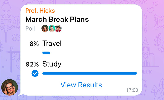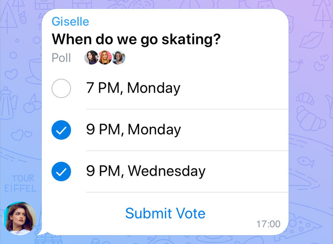 Теперь можно создавать опросы, позволяющие всем участникам группы видеть, кто за какой вариант проголосовал. Такая функция есть в сторонних приложениях (например, @votebot), но в самом Telegram раньше все опросы были анонимными. Они тоже никуда не делись.
